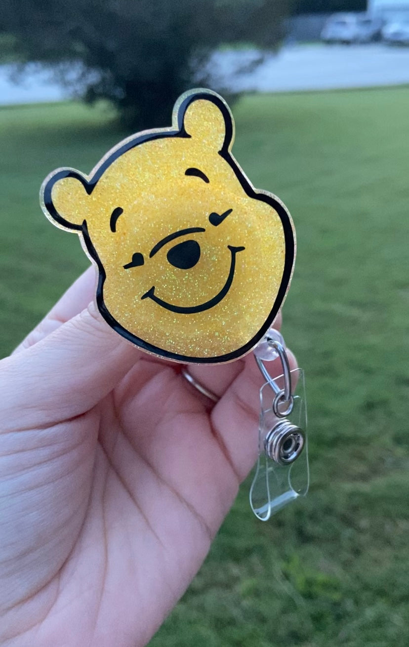 This cute badge reel is a 2 inch acrylic piece that is handmade with glitter and vinyl and then sealed with resin for cleanliness and durability.
