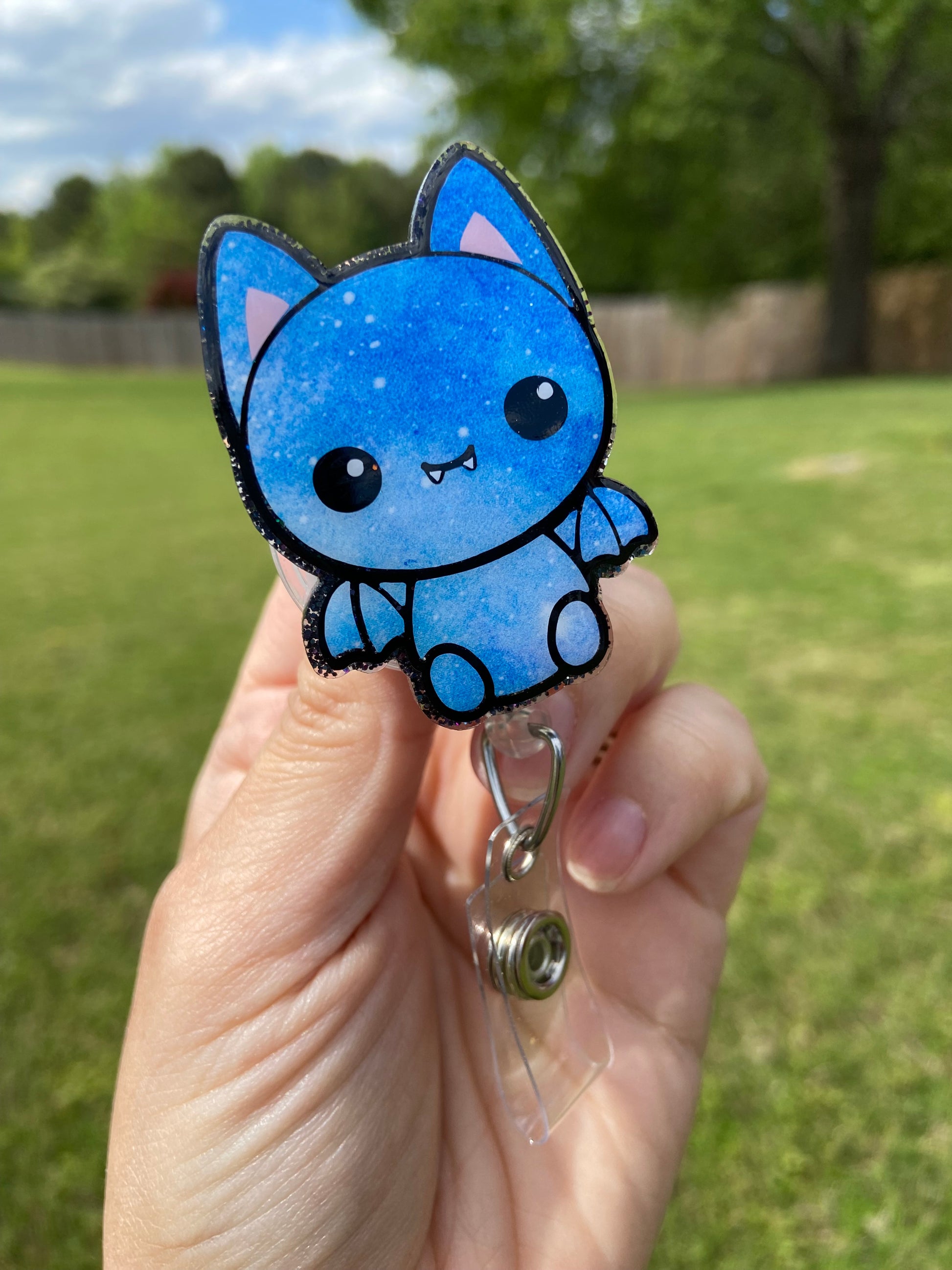 This cute badge reel is a 2 inch acrylic piece that is handmade with glitter and vinyl and then sealed with resin for cleanliness and durability.