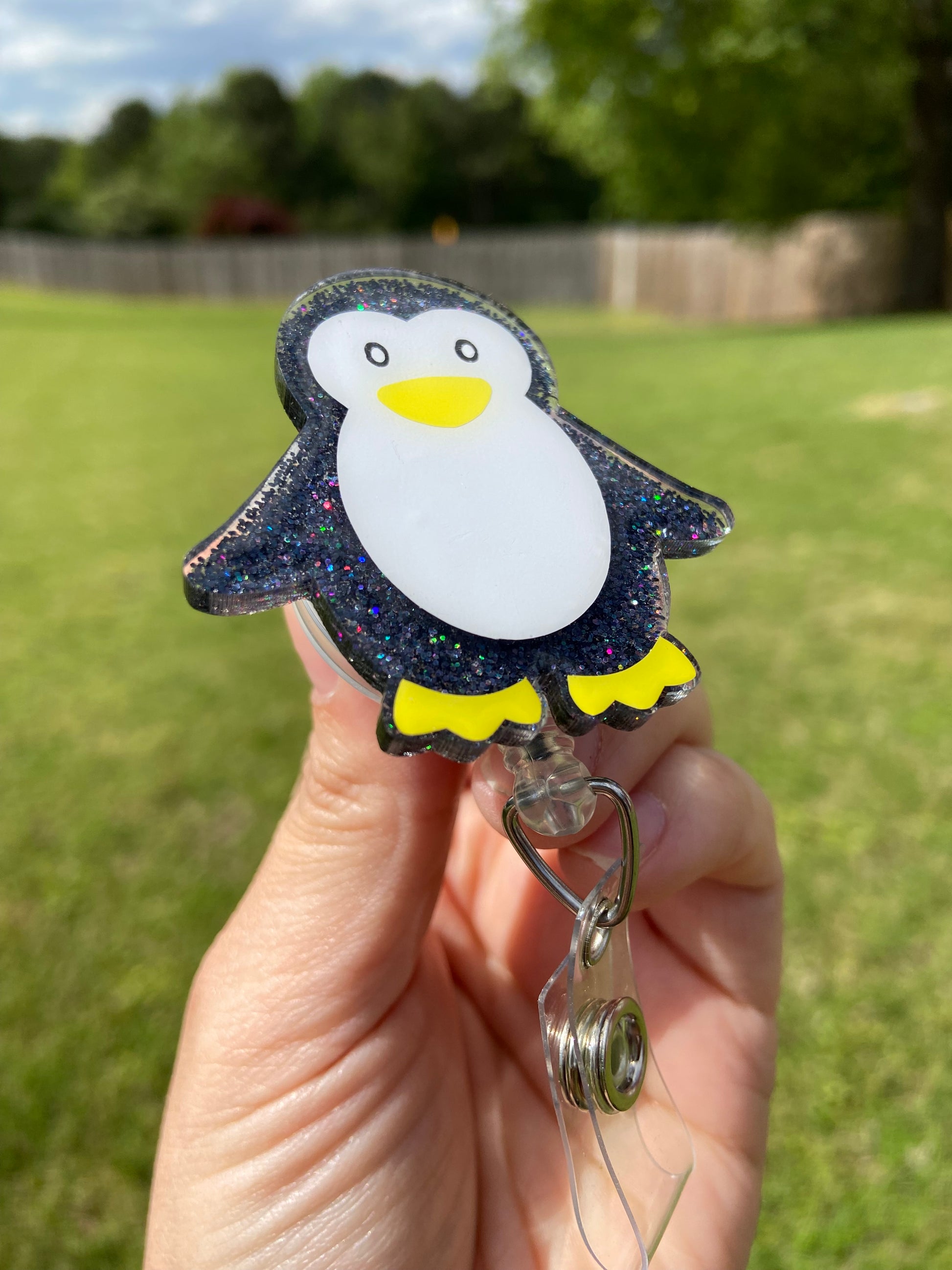 This cute badge reel is a 2 inch acrylic piece that is handmade with glitter and vinyl and then sealed with resin for cleanliness and durability.
