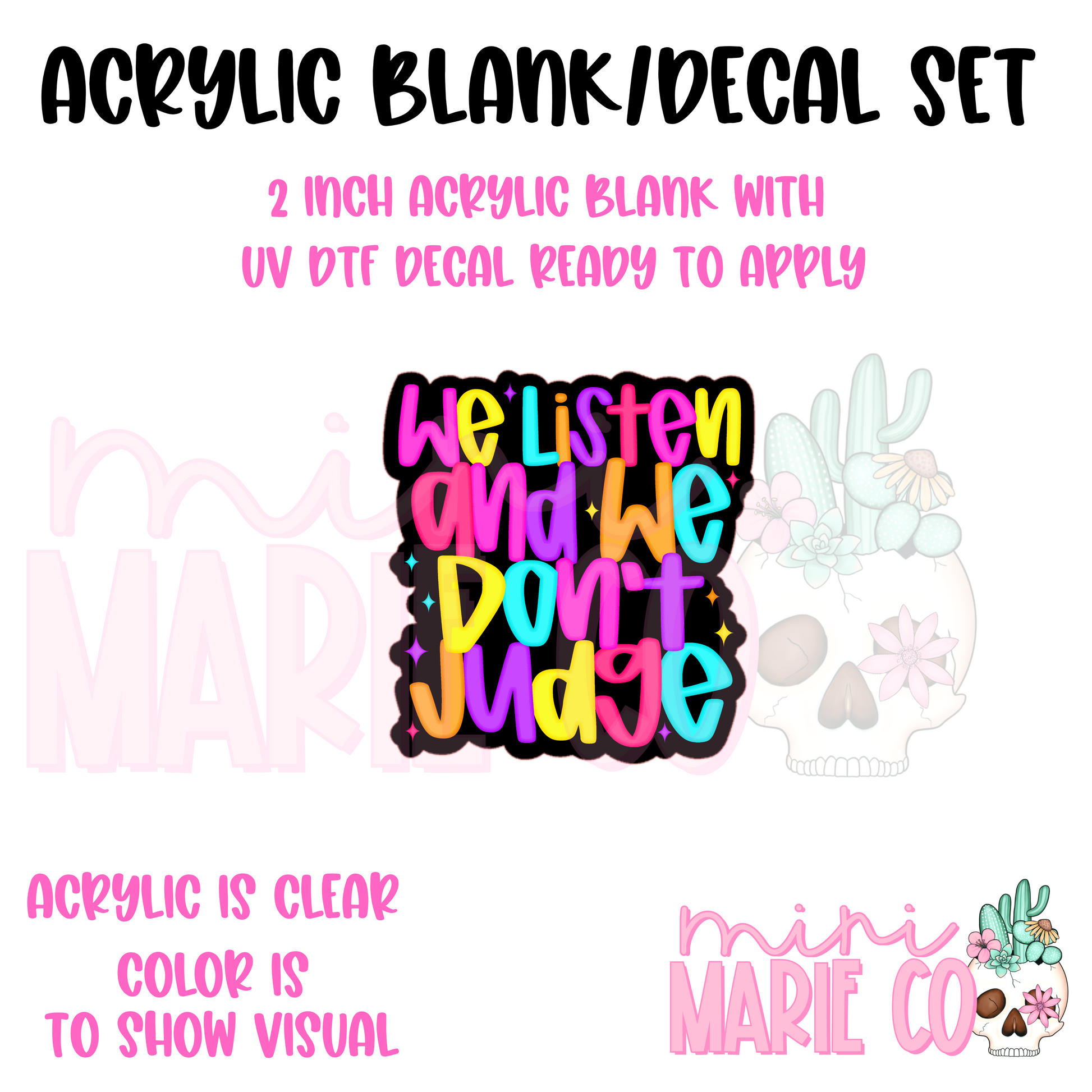 We Listen and We Don't Judge Colorful Acrylic Blank/ UV DTF Decal Set